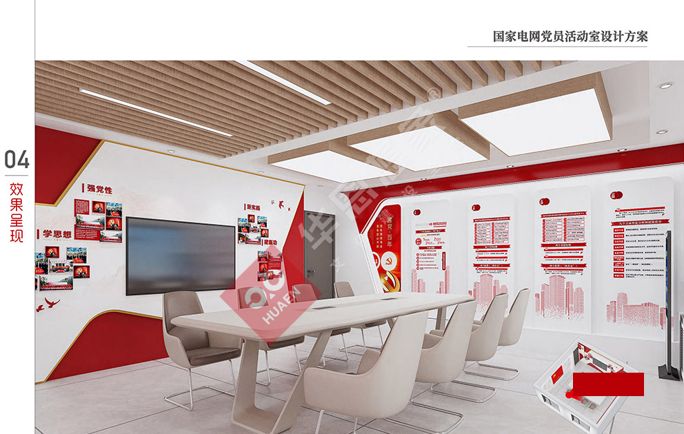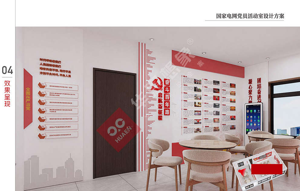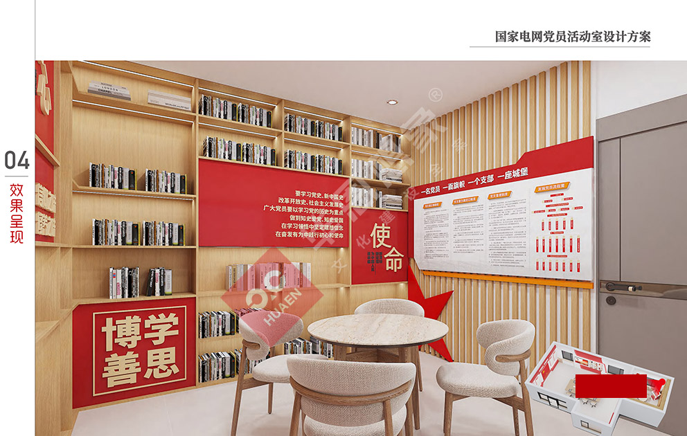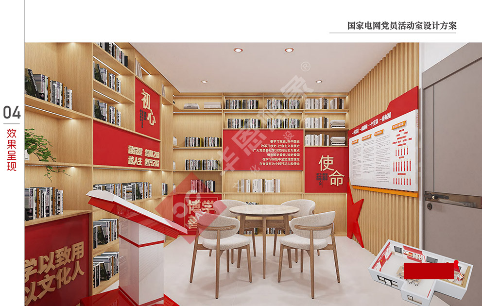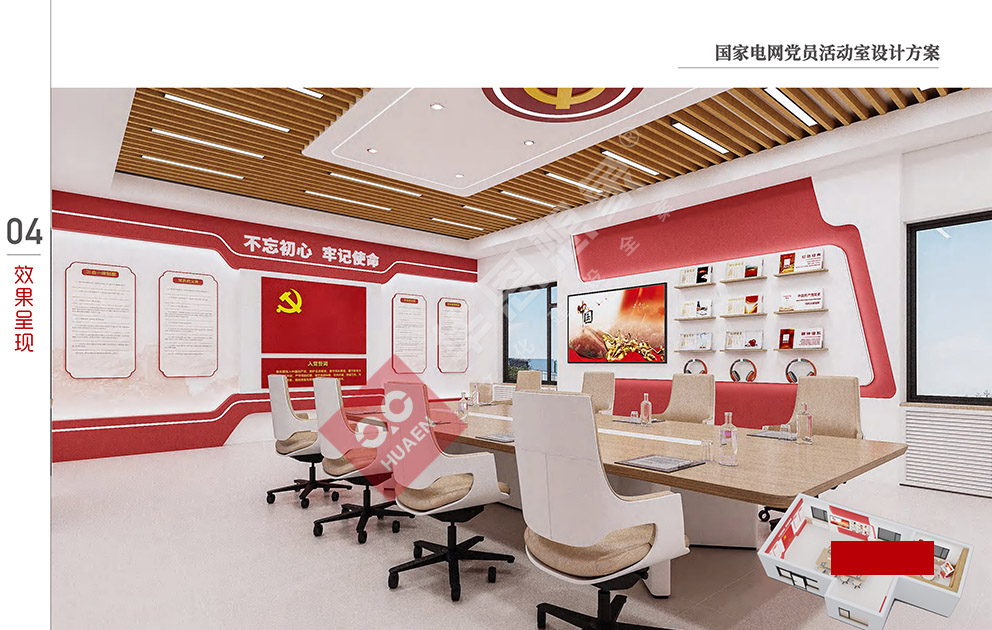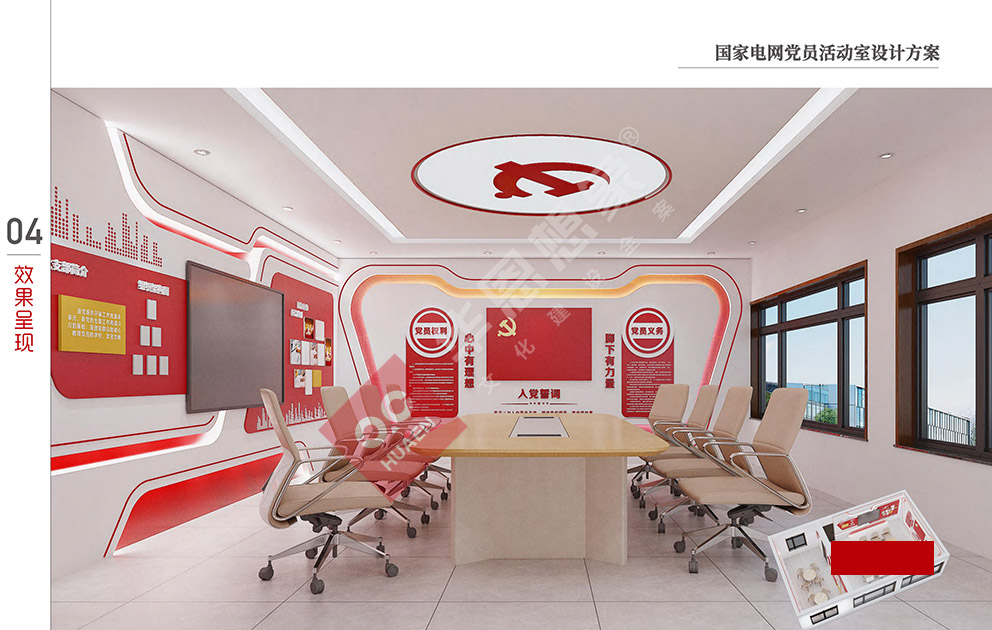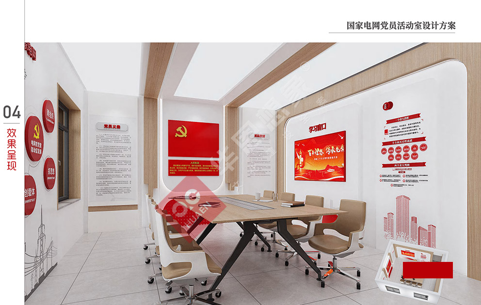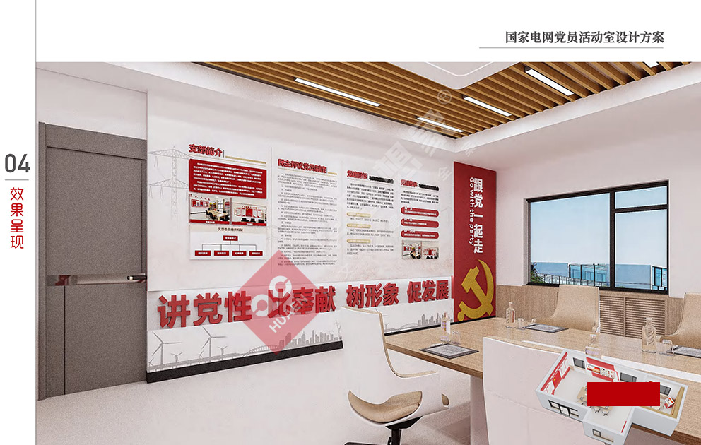 設(shè)計理念:黨員活動室的建立,不僅是黨支部開展活動的主要陣地,更是黨支部團結(jié)職工群眾、加強思想政治建設(shè)的主要場所。黨員活動室要按照布局合理、美觀整潔、特色鮮明、氛圍濃厚的要求進行布置??臻g圍繞開會學習加入黨建文化。主要設(shè)計有宣誓文化墻和黨的二十大文化墻; 宣誓文化墻讓廣大黨員增強黨員意識、爭做合格黨員的基礎(chǔ)。黨的二十大文化墻重溫黨的光輝歷程,學習新時代精神,從我們黨的光輝歷程和偉大成就中弘揚偉大的建黨精神。