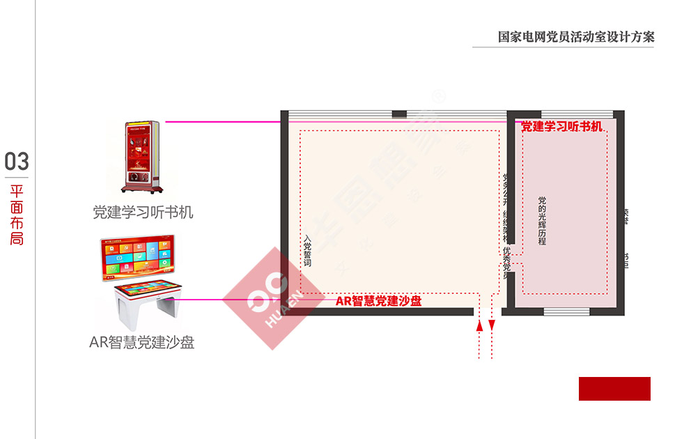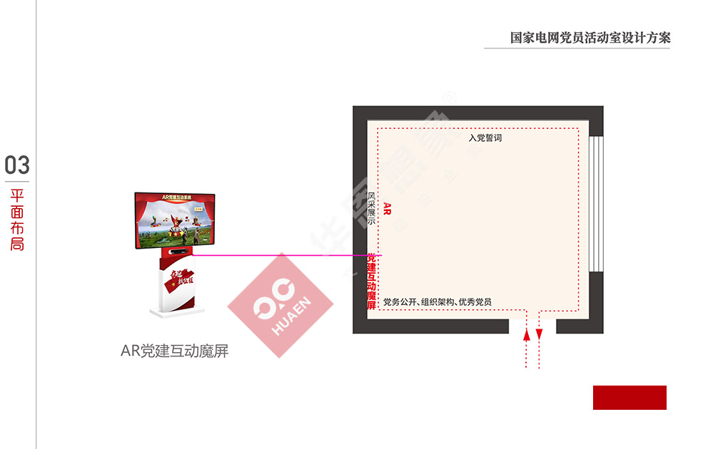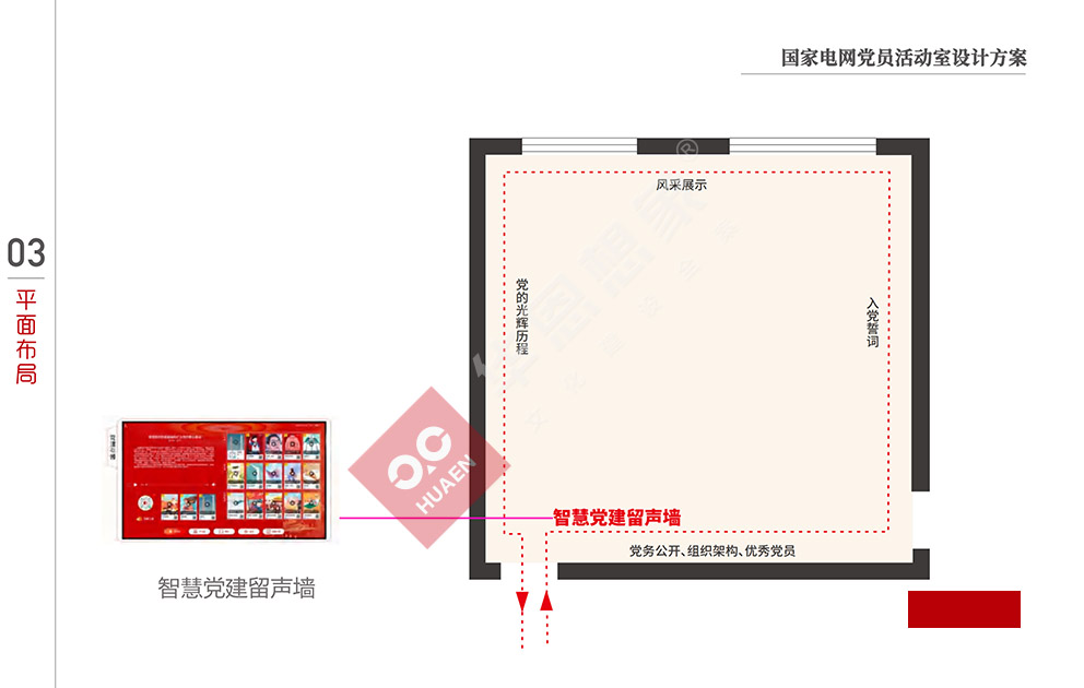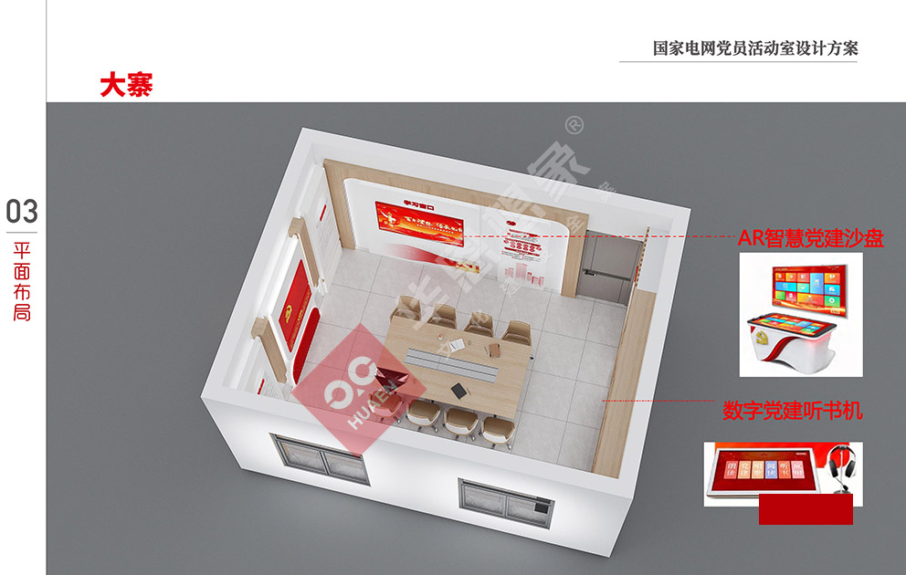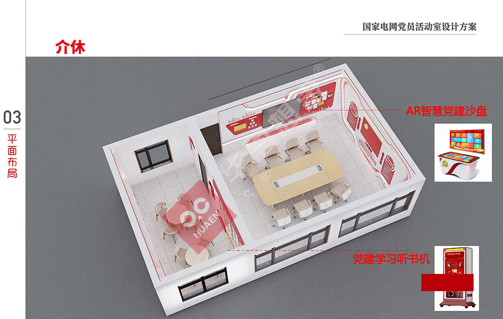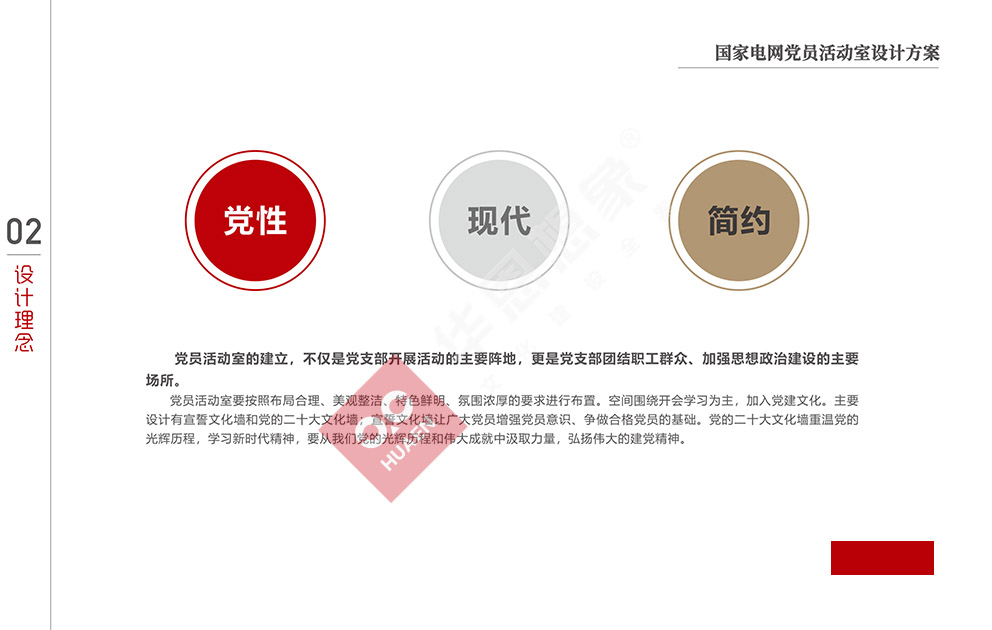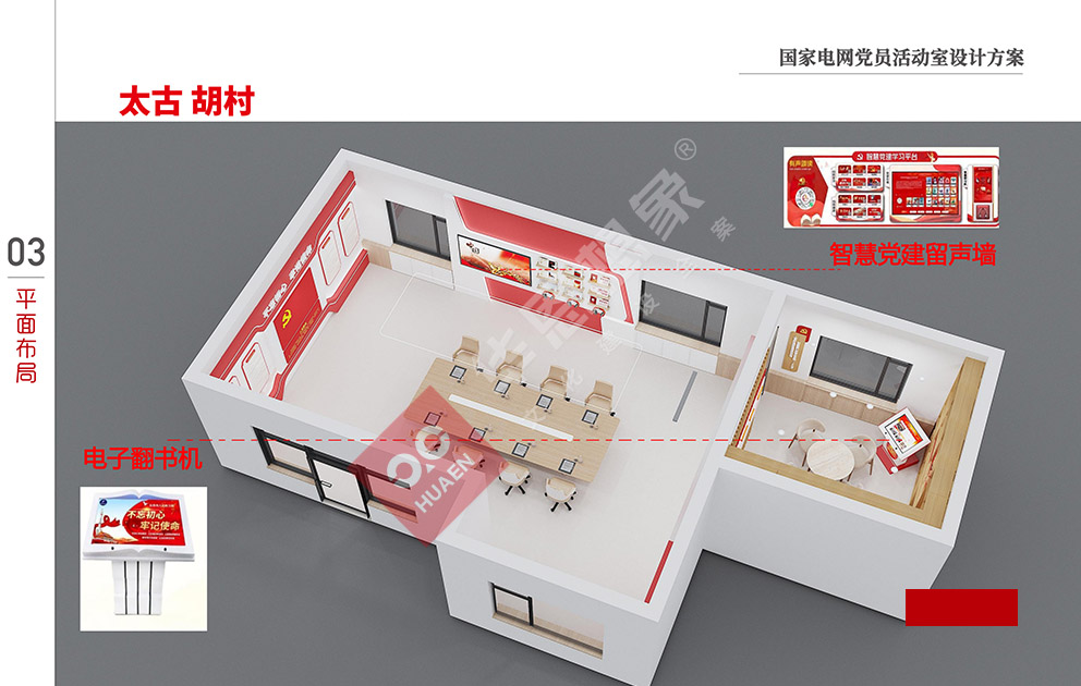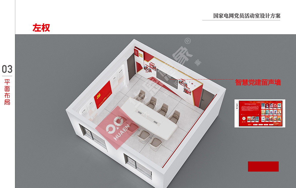 設(shè)計理念:黨員活動室的建立,不僅是黨支部開展活動的主要陣地,更是黨支部團結(jié)職工群眾、加強思想政治建設(shè)的主要場所。黨員活動室要按照布局合理、美觀整潔、特色鮮明、氛圍濃厚的要求進行布置??臻g圍繞開會學習加入黨建文化。主要設(shè)計有宣誓文化墻和黨的二十大文化墻; 宣誓文化墻讓廣大黨員增強黨員意識、爭做合格黨員的基礎(chǔ)。黨的二十大文化墻重溫黨的光輝歷程,學習新時代精神,從我們黨的光輝歷程和偉大成就中弘揚偉大的建黨精神。