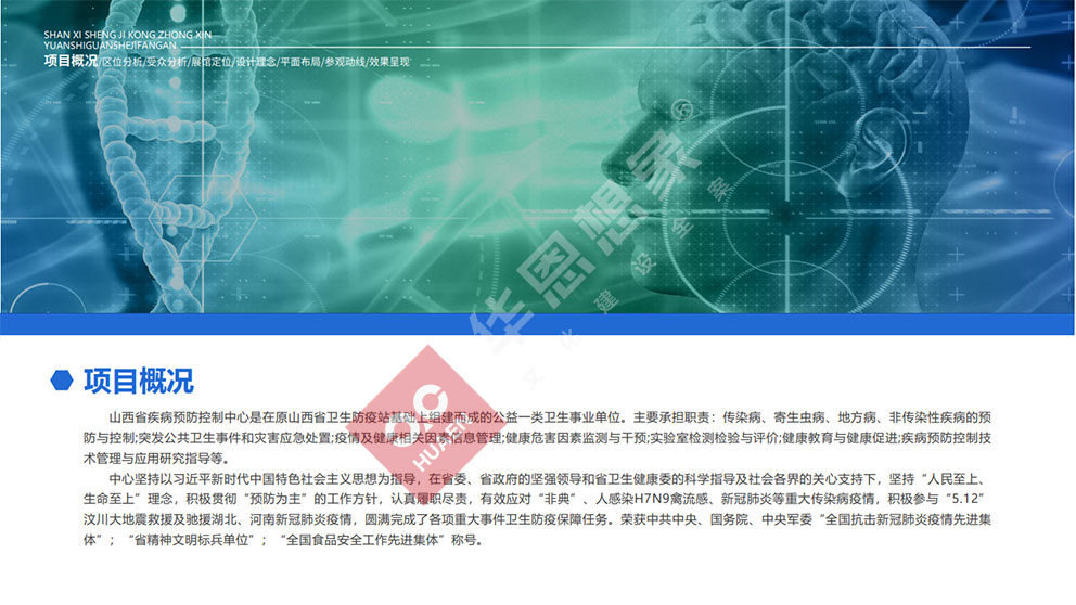 設計理念:山西省疾病預防控制中心是在原山西省衛(wèi)生防疫站基礎上組建而成的公益-類衛(wèi)生事業(yè)單位。主要承擔職責 : 傳染病、寄生蟲病、地方病、非傳染性疾病的預防與控制突發(fā)公共衛(wèi)生事件和災害應急處置;疫情及健康相關因素信息管理健康危害因素監(jiān)測與干預;實驗室檢測檢驗與評價;健康教育與健康促進;疾病預防控制技術管理與應用研究指導等。中心堅持以習近平新時代中國特色社會主義思想為指導,在省委、省政府的堅強領導和省衛(wèi)生健康委的科學指導及社會各界的關心支持下,堅持 “人民至上、生命至上” 理念,積極貫徹“預防為主”的工作方針,認真履職盡責,有效應對”非典"、人感染H7N9禽流感、 新冠肺炎等重大傳染病疫情積極參與"5.12"汶川大地震救援及馳援湖北、河南新冠肺炎疫情,圓滿完成了各項重大事件衛(wèi)生防疫保障任務。榮獲中共中央、國務院、中央軍委“全國抗擊新冠肺炎疫情先進集體”、“省精神文明標兵單位”、“全國食品安全工作先進集體”稱號。