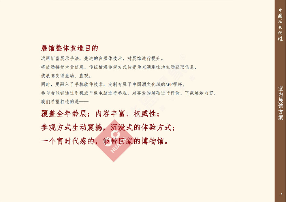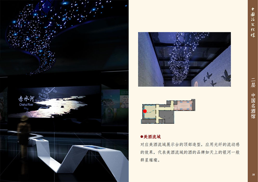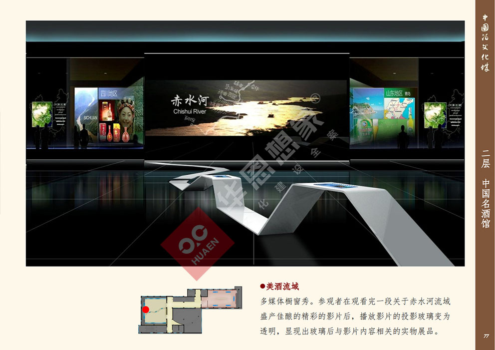 設(shè)計理念:展館整體改造目的運用新型展示手法,先進(jìn)的多媒體技術(shù),對展館進(jìn)行提升。將被動接受大量信息、傳統(tǒng)枯燥參觀方式轉(zhuǎn)變?yōu)槌錆M趣味地主動獲取信息,使展陳變得生動、直觀同時,更融入了手機(jī)軟件技術(shù),定制專屬于中國酒文化城的APP程序。參與者能夠通過手機(jī)或平板電腦進(jìn)行參觀,對喜愛的展項進(jìn)行評價、下載展示內(nèi)容我們希望打造的是一一覆蓋全年齡層,內(nèi)容豐富、權(quán)威性;參觀方式生動震撼,沉浸式的體驗方式;一個富時代感的,能帶回家的博物館。
